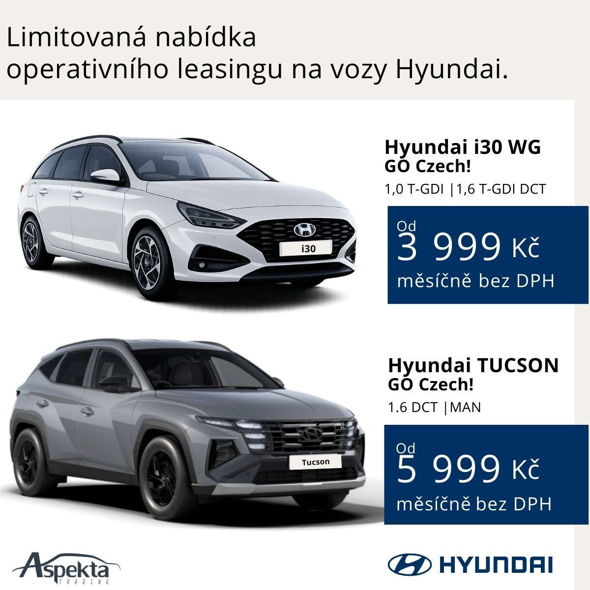 Využijte limitovanou nabídku operativního leasingu na oblíbené modely Hyundai i30 WG a TUCSON v edici Go Czech! a jezděte bez starostí.